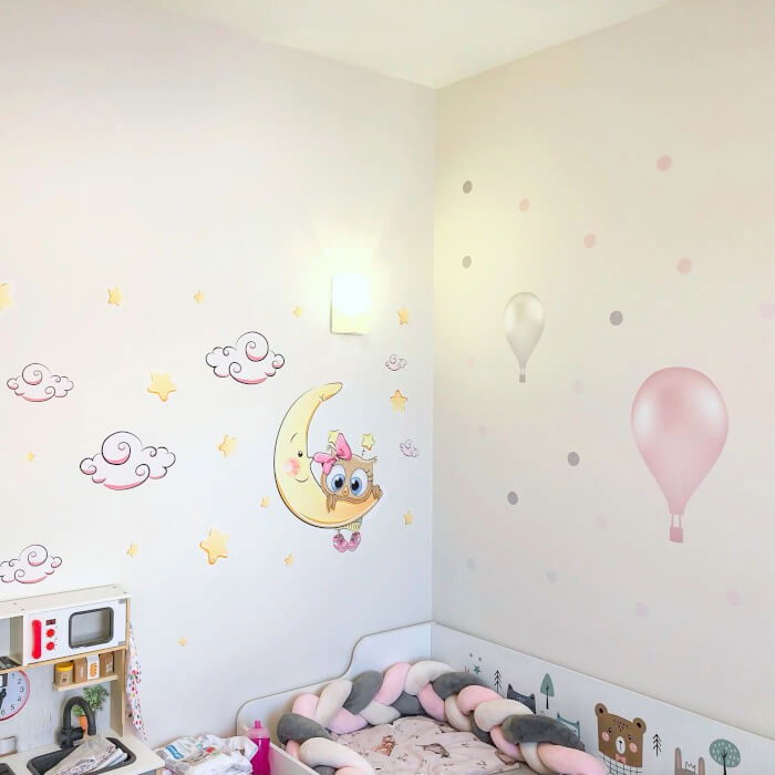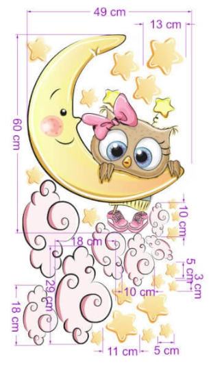 Autocolantul Bufnita roz pe luna cu nori si stele este perfect pentru orice spatiu, adaugand un strop de personalitate si stil. Fabricat din materiale de inalta calitate, acest autocolant este ideal pentru a imbunatati decorul si a crea o atmosfera placuta in casa ta. Usor de aplicat si de intretinut, acest autocolant transforma orice camera intr-un colt de paradis.