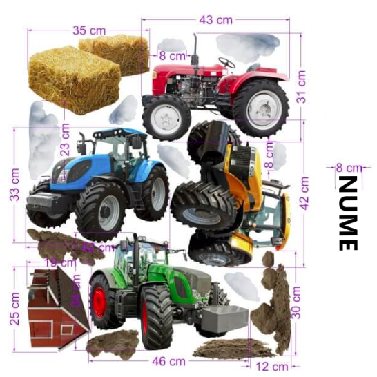 Adauga un zambet pe chipul micutului tau cu autocolantul de perete cu tractoare si nume personalizabil – un cadou perfect pentru orice mic fermier in devenire!