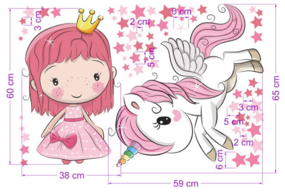 Autocolant de Perete: Printesa si unicorn + stele, printesa 60 x 38 cm, unicorn 68 x 55 cm
