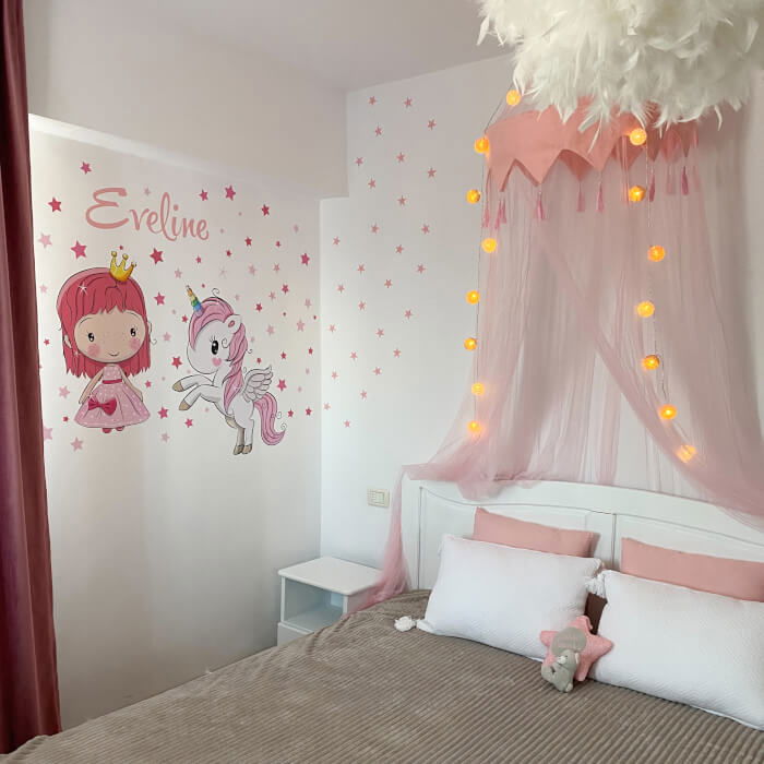 Design: Printesa si unicorn insotiti de stele, creand o scena de vis pentru camera copilului tau.