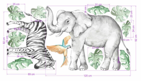 Autocolante pentru perete - elefant si zebra din safari este perfect pentru orice spatiu, adaugand un strop de personalitate si stil. Fabricat din materiale de inalta calitate, este ideal pentru a imbunatati decorul si a crea o atmosfera placuta in casa ta. Usor de aplicat si de intretinut, acest autocolant transforma orice camera intr-un colt de paradis.