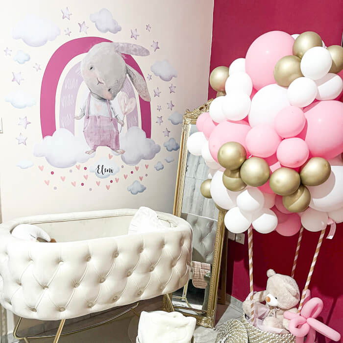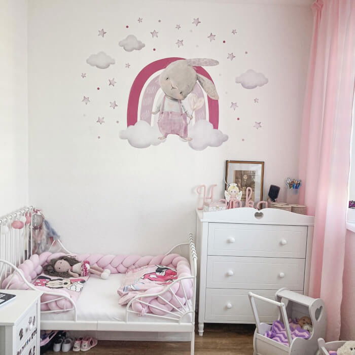 Autocolante pentru perete - iepuras, curcubeu in culori roz este perfect pentru orice spatiu, adaugand un strop de personalitate si stil. Fabricat din materiale de inalta calitate, este ideal pentru a imbunatati decorul si a crea o atmosfera placuta in casa ta. Usor de aplicat si de intretinut, acest autocolant transforma orice camera intr-un colt de paradis.