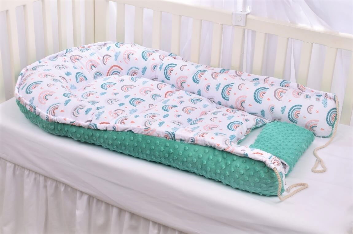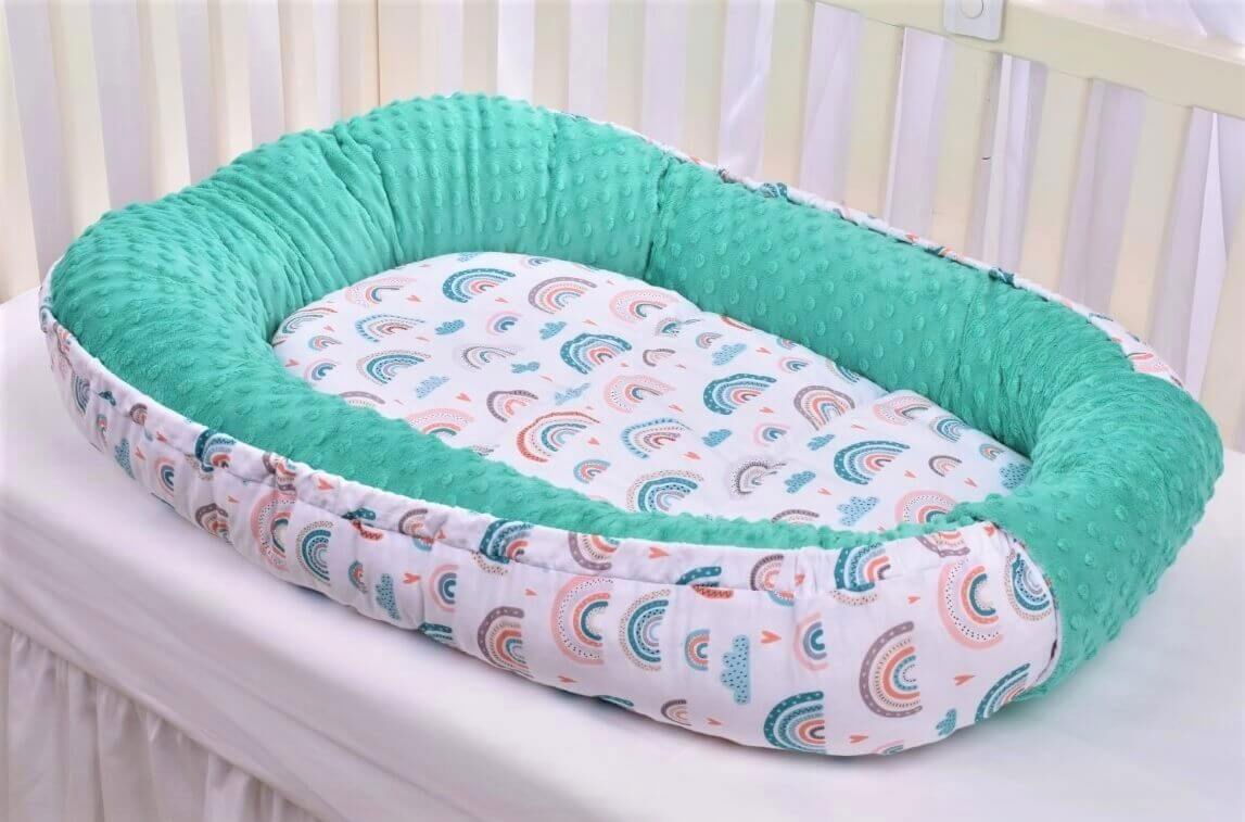 Cele doua fete se pot folosi dupa preferinta ta. O parte este din bumbac 100%, cealalta din minky pufos, iar interiorul este din vatelina cu proprietati hipoalergenice. Salteluta detasabila este din bumbac 100% pe ambele parti. Peretii cosuletului sunt umpluti cu puf siliconat hipoalergenic, certificat OEKO TEX, sigur pentru nou nascuti.