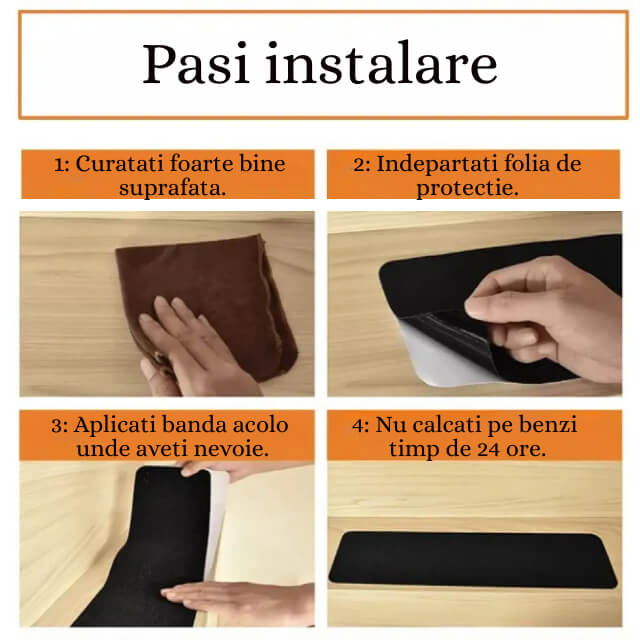 Usor de utilizat: benzile sunt usor de aplicat si pot fi indepartate fara a lasa urme, ceea ce le face o alegere ideala pentru oricine poate avea probleme cu alunecarea pe trepte.