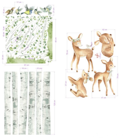 Fiecare copac, iarba, ramura, frunza si animal sunt parti separate ale autocolantului, pentru a putea fi creativ la aranjarea lor. Aplica animalele si copacii pentru a decora perfect peretele.