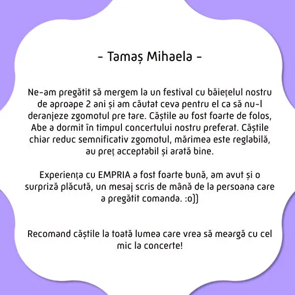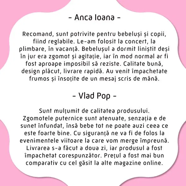 Știm că nivelul de 20-30 decibeli este considerat inofensiv pentru organismul uman. Suntem în deplină conformitate cu standardele Organizației Mondiale a Sănătății, iar căștile noastre oferă o protecție adecvată împotriva sunetelor puternice, păstrându-ți copilul departe de zgomotele dăunătoare.