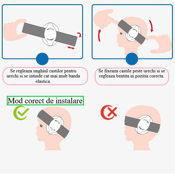 Cupele trebuie să acopere complet urechea, fără goluri. Banda elastică trebuie să fixeze căștile fără să strângă.