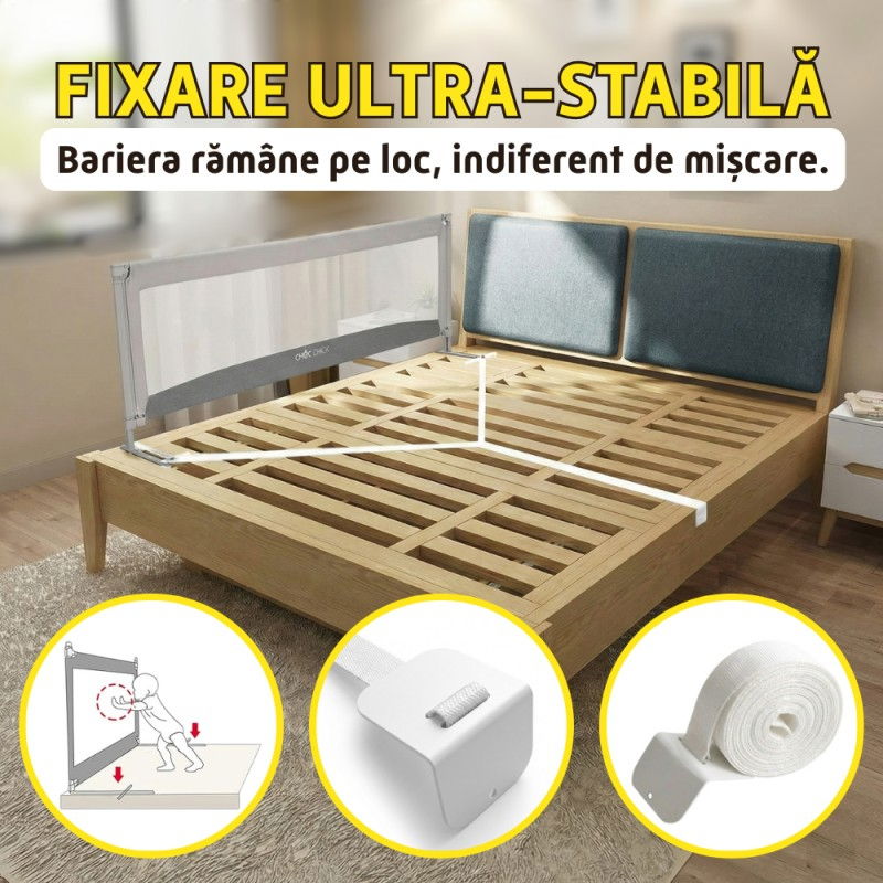 Pentru fixare suplimentară a barierei și stabilitate mai bună, mai ales dacă nu vrei să găurești somiera sau placajul patului.
