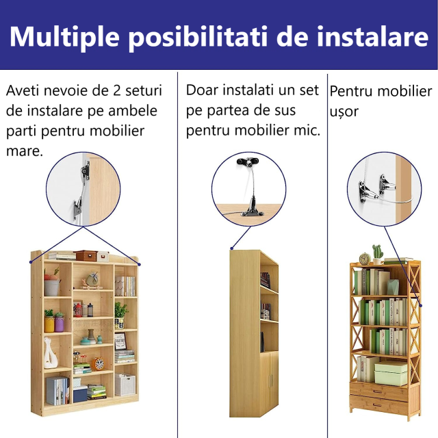 Pachetul contine 2 seturi chingi metalice impotriva daramarii mobilierului.