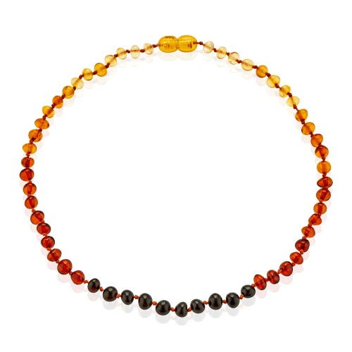 Un snur fabricat dintr-un material hipoalergenic este folosit pentru a insira boabele de chihlimbar. Inchizatoarea este speciala conceputa pentru cei mici astfel incat sa previna ciupiturile. Colierul poate fi dintr-o singura culoare sau multicolor.