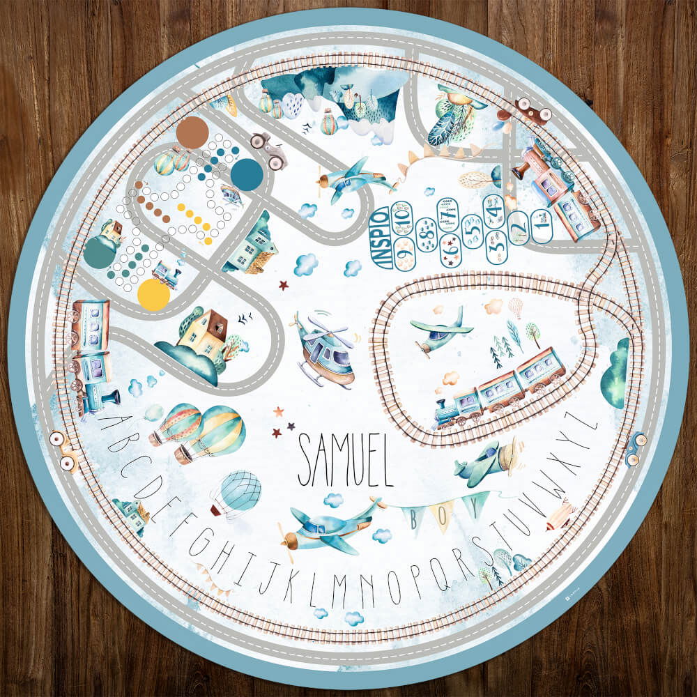 Covorul de joaca rotund INSPIO cu tema de calatorii este perfect pentru a crea un spatiu de joaca sigur, confortabil si educativ pentru copiii dumneavoastra. Cu un design atragator si multiple beneficii, acest covor va deveni rapid centrul atentiei in orice camera de copil, incurajand joaca si invatarea intr-un mod placut si interactiv.