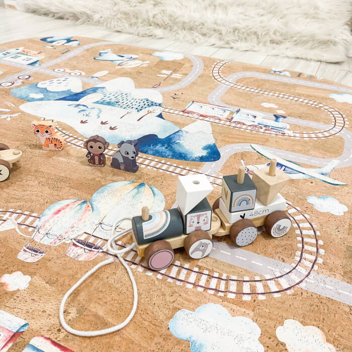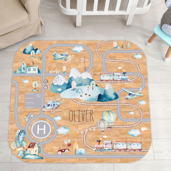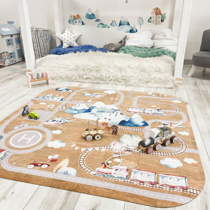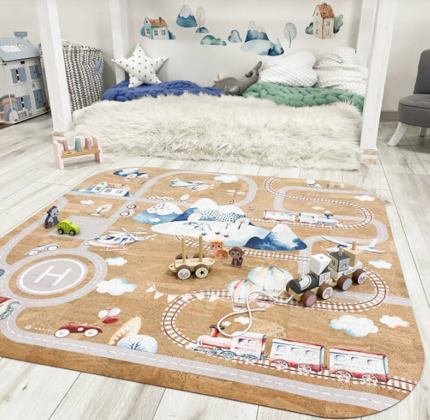 Covorul de joaca INSPIO, cu tematica de tren si avioane, este creat special pentru a stimula imaginatia si creativitatea copiilor. Realizat din materiale naturale si imprimat cu culori ecologice, acest covor ofera un spatiu de joaca sigur, confortabil si educativ.
