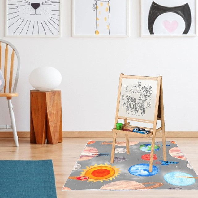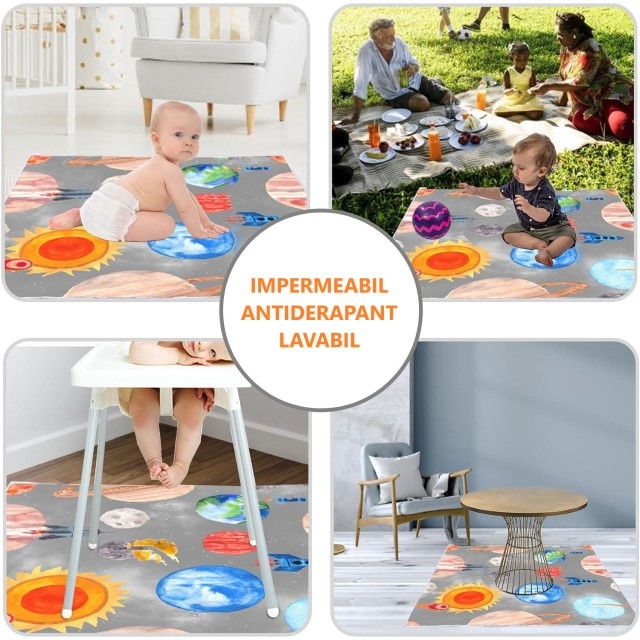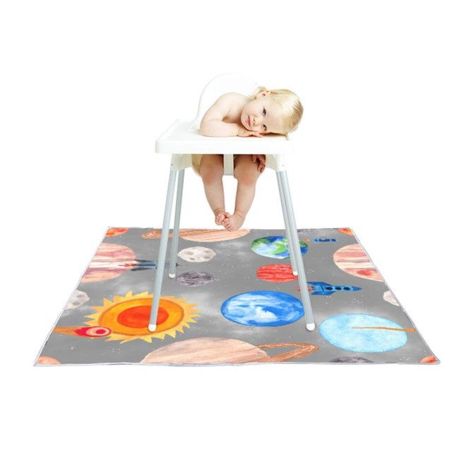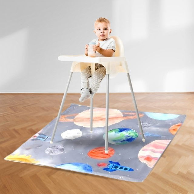 Acest produs este adesea folosit de parinti pentru a proteja podeaua de murdaria creata de bebelus in timpul mesei. In plus, cu dimensiunile generoase de 130x130 cm, acest covoras este suficient de mare pentru a acoperi o zona semnificativa din jurul scaunului de masa. Asta inseamna ca nu doar zona imediata de sub scaun este protejata, ci si cea din apropiere, unde micutul ar putea arunca mancare sau jucarii.