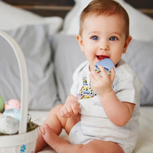 Cravata pentru bebelusi cu jucarie pentru dentitie BabyJem este disponibila in doua culori: bleu si ecru.