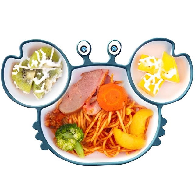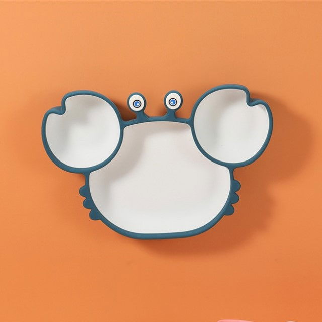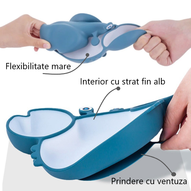 Iti recomandam o farfurie compartimentata din silicon moale, cu ventuza anti-alunecare, marca Empria. Aceasta farfurie are o forma draguta si foarte atragatoare pentru cei mici, este in forma de crab.