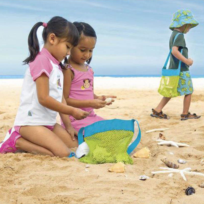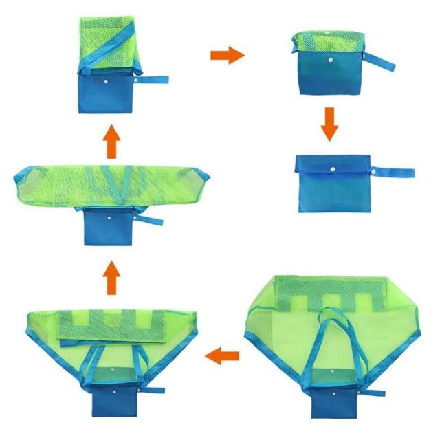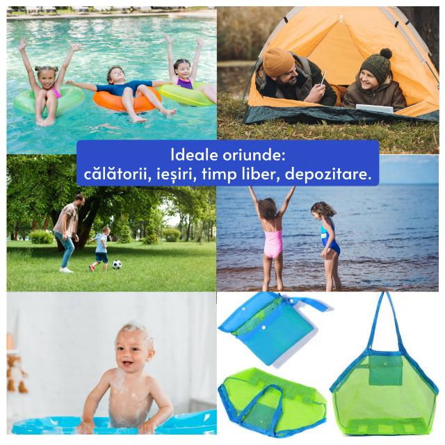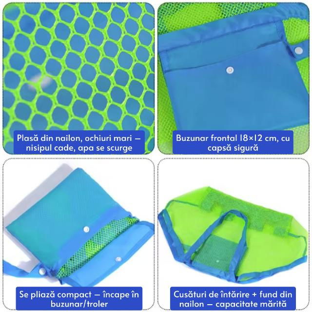 Geanta de plaja este fabricata din material de nailon cu plasa foarte usoara cu gauri mari pentru a cadea nisipul de pe plaja sau pentru a permite scurgerea apei din echipamentul de inot si pentru uscare rapida. Poate fi folosita pentru diverse lucruri, cum ar fi jucarii pentru plaja, prosoape, haine sau diverse accessorii pentru inot. Permite jucariilor sa se usuce rapid. Folosita cu succes si pentru camping sau alte activitati de iesire sau calatorii. In aceasta geanta din plasa poti pune tot ce ai nevoie.