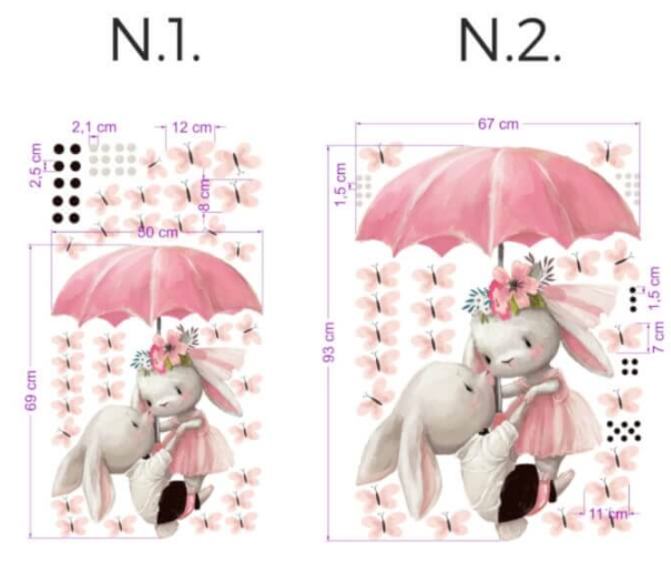 • N.1.: Autocolant mare cu iepurasi h. 69× l. 50 cm (cand este lipit ca in imagine), 32 fluturi, 22 puncte