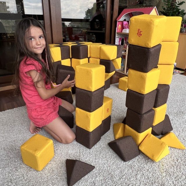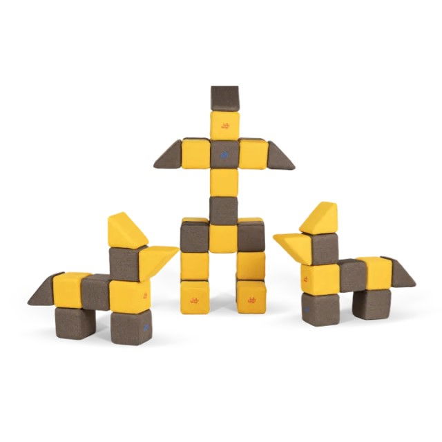 Primești un set de 50 piese variate (cuburi, triunghiuri, piramide), cu textură plăcută și polaritate echilibrată, ideale pentru dezvoltarea imaginației, motricității și jocurilor creative.