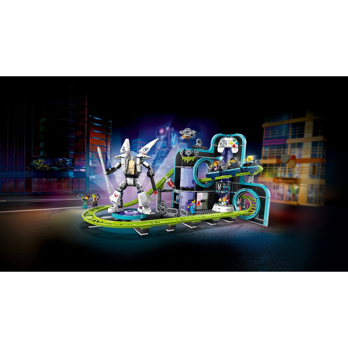 Copiii care indragesc jocurile video si jucariile pe tema parcurilor de distracţii vor adora acest set cu roller-coaster complet funcţional. Jucaria de aventura LEGO® City Parc cu roller-coaster Lumea Roboţilor (60421) e Modelul include elemente interactive si accesorii tematice pentru joaca captivanta.