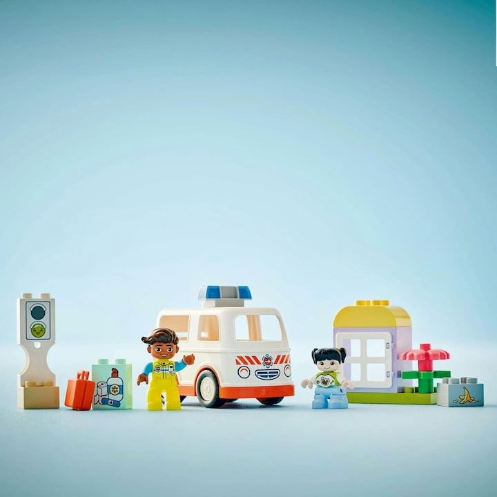 Setul include o ambulanta care se conduce cu usurinta si 2 figurine DUPLO: un paramedic si o fata. Copiii deschid acoperisul, aseaza pacienta pe patul rabatabil si pornesc spre „spital”. O roata de joc imprimata ii ajuta sa exprime cum se simte fetita (speriata, linistita, curajoasa) si sa discute despre „prima data cand am vazut o ambulanta”. Piesele mari sunt sigure si usor de apucat, iar povestile decurg natural: sirena, evaluare, ingrijire, transport – toate pe intelesul celor mici.