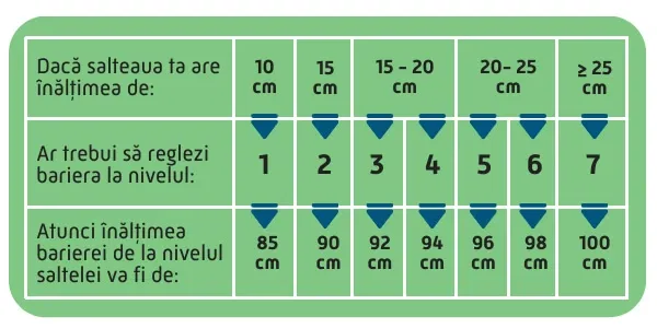 Poți regla barierele, pe 7 niveluri de înălțime iar relația dintre această înălțime și grosimea recomandată a saltelei este prezentată în tabelul următor.