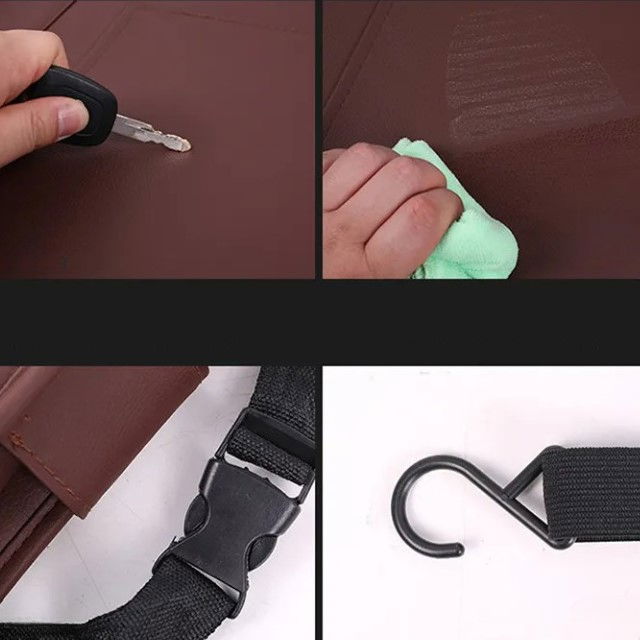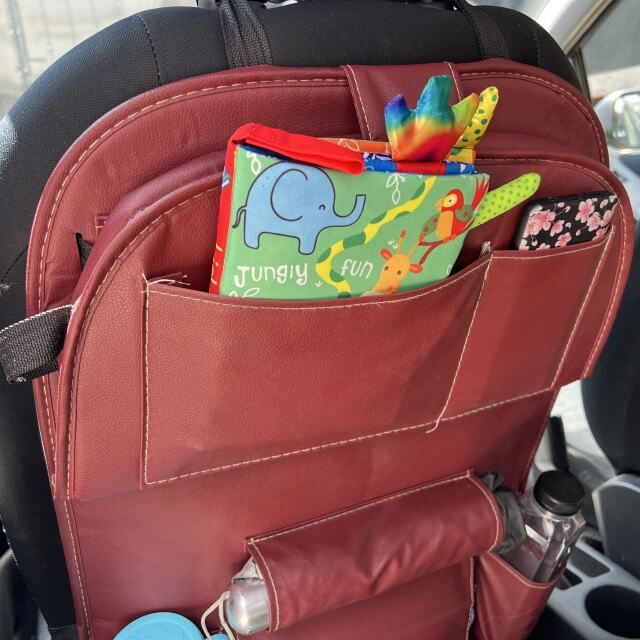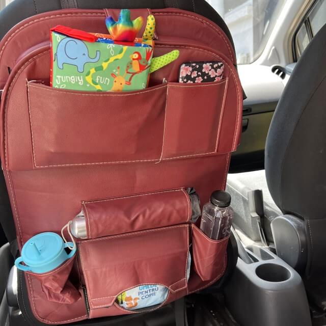 Acest produs are dubla intrebuintare. Poate fi un organizator pentru diverse lucruri si in acelasi timp protejeaza scaunul auto de posibile urme de pe incaltaminte.