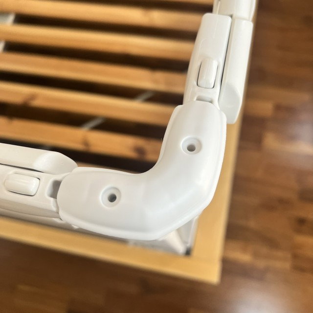 Foarte bun. Rigid. Se ancoreaza foarte puternic de patul de lemn. Cel mic e foarte fericit si invata sa mearga tinandu-se de el. In imagine este setat sa stea cat mai jos.