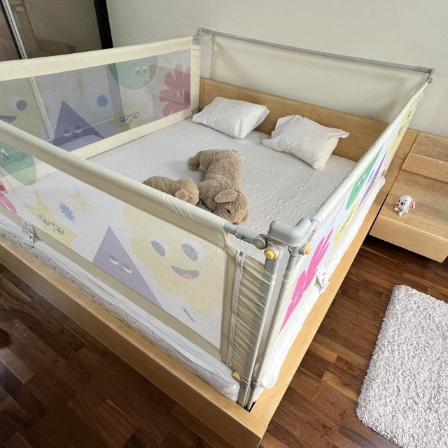 Pentru paturi 200×180 cm, configurația de tip „mini-țarc” pe 3 laturi este ușor de obținut cu acest pachet: 2 bariere Basic de 200 cm + 1 barieră Basic de 180 cm și bară stabilizatoare de 180 cm (pentru aliniere și rigiditate în setul cu 3 bariere).