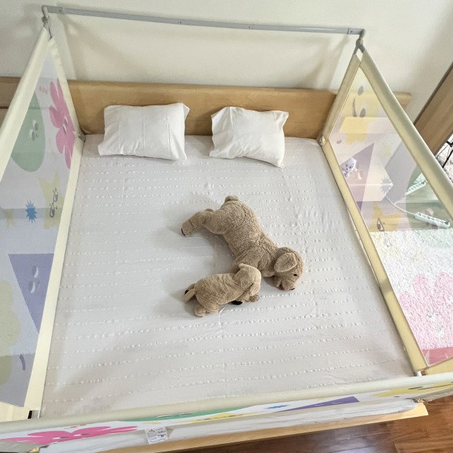 Notă: Înălțimea deasupra saltelei depinde de grosimea saltelei. După montaj, verifică să nu rămână spațiu între saltea și partea inferioară a barierei.