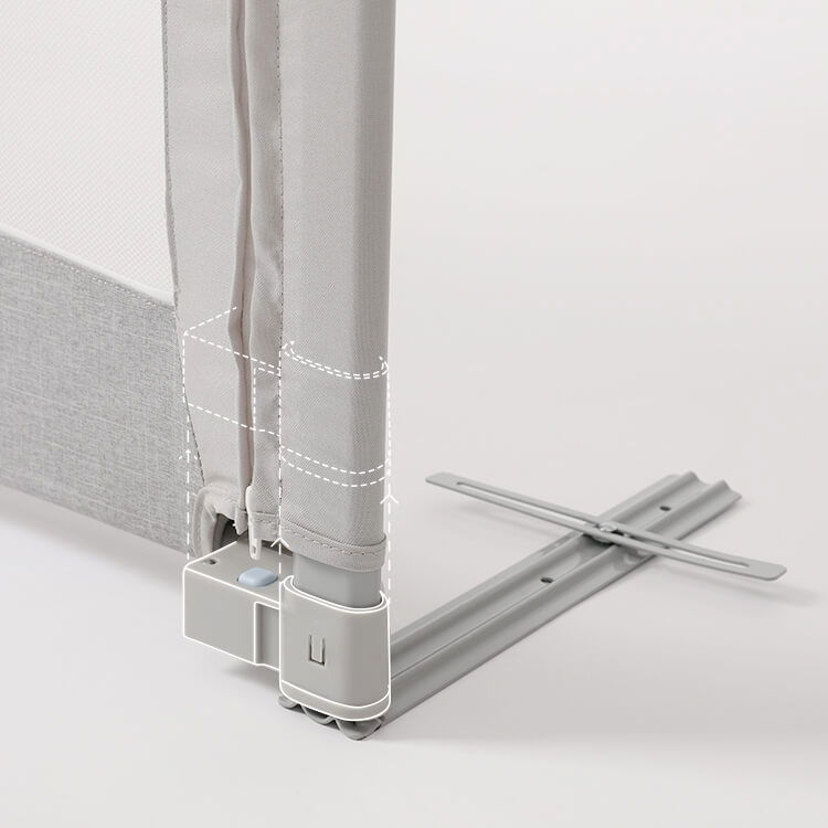 Ajustarea se face simplu, printr-un buton de reglare a înălțimii amplasat lateral. Ridici sau cobori bariera în poziția dorită, păstrându-i stabilitatea. De asemenea, bariera se poate coborî aproape de nivelul inferior al saltelei, pentru a-ți ușura accesul atunci când vrei să schimbi lenjeria sau să-ți așezi copilul în pat fără să-l trezești.