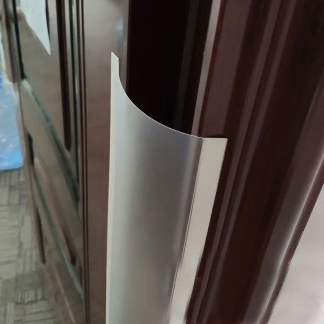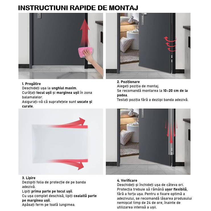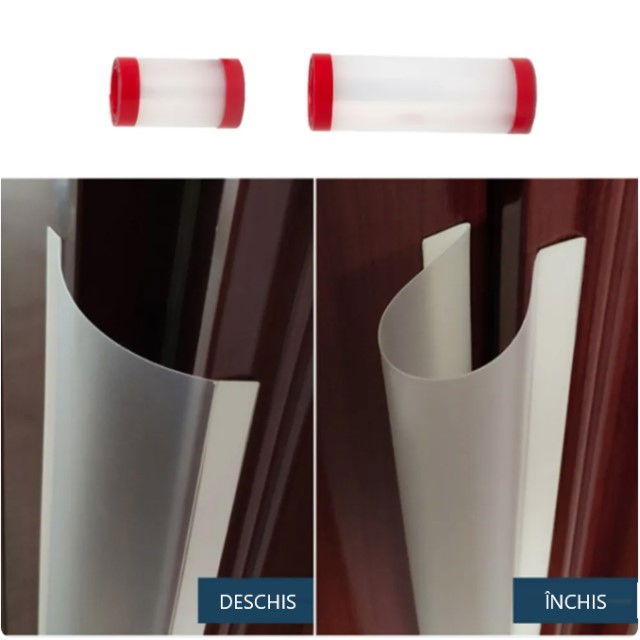 Protectia se monteaza cu banda adeziva deja fixata pe laterale. Aceasta banda se indeparteaza si marginile se lipesc pe tocul usii si pe marginea usii.