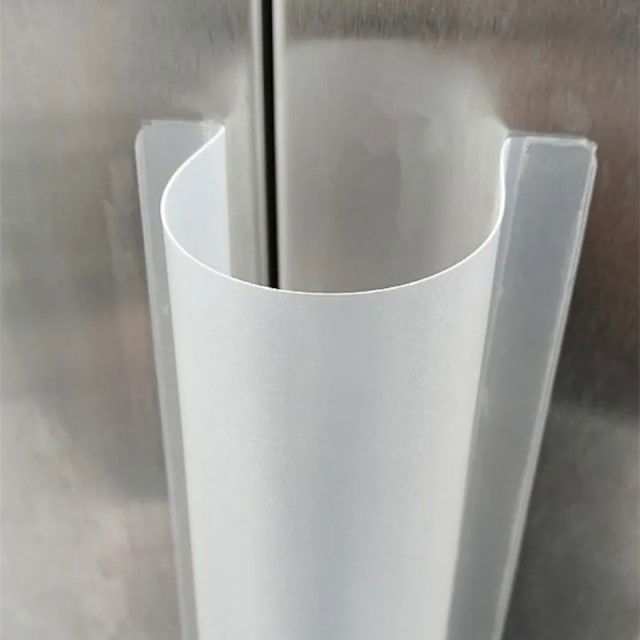 Pe fiecare latura a foliei de plastic exista benzi adezive. Pentru montare se dezlipeste folia protectoare de pe benzile adezive si se lipeste protectia prima data pe cadrul usii, iar cealalta parte pe usa. Este foarte important ca usa sa fie deschisa la maximum si sa stabiliti unde se va lipi. In acest fel evitati situatia in care protectia v-ar impiedica ulterior sa deschideti bine usa.