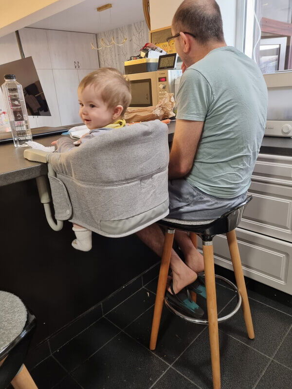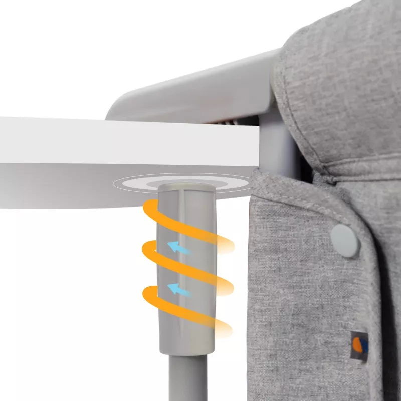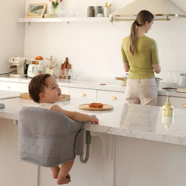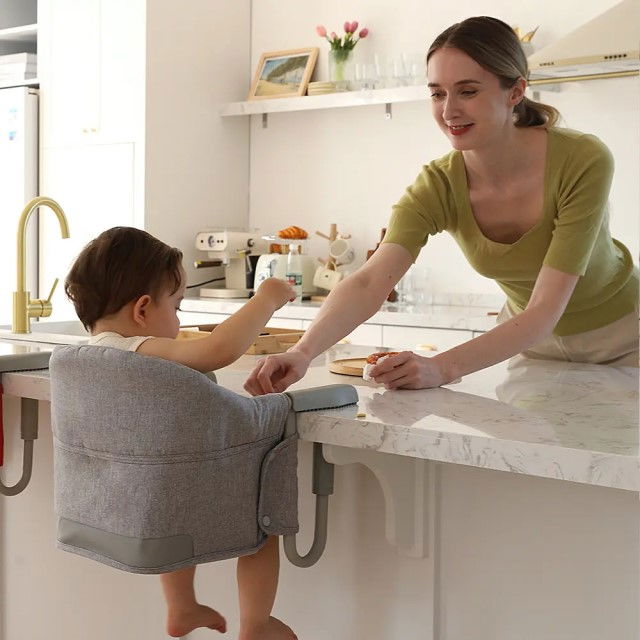 Scaunul poate fi atasat si la biroul mamei. Acesta este proiectat pentru a oferi confort si siguranta copilului, in timp ce mama lucreaza.