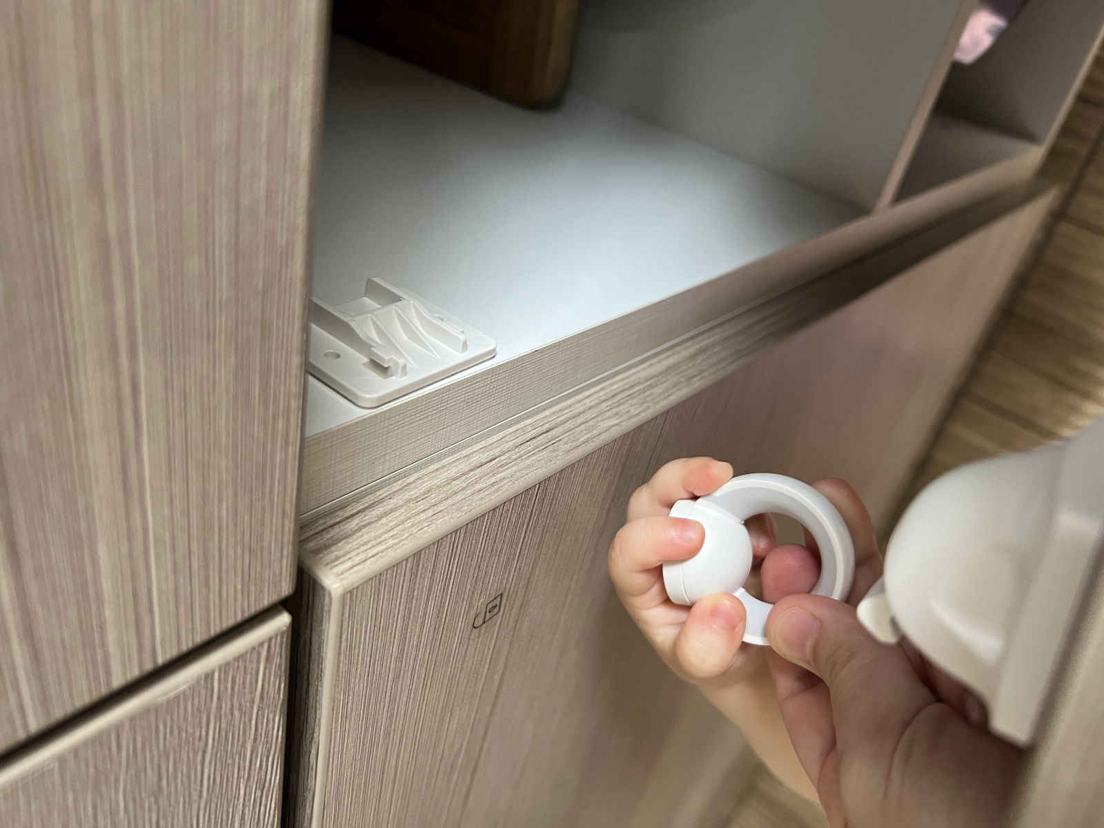 Pasul 4: (img.4) Dezlipiti folia de protectie a bandei dublu-adeziva de pe siguranta magnetica. Inchideti sertarul complet, iar apoi deschideti pentru a verifica daca blocatorul a ramas lipit de usa dulapului. Apasati ferm incuietoarea usii pentru a imbunatati conexiunea.