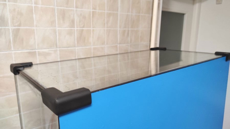 Protectie pentru colt in forma U aplicata pe o masa de sticla.