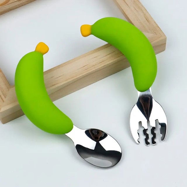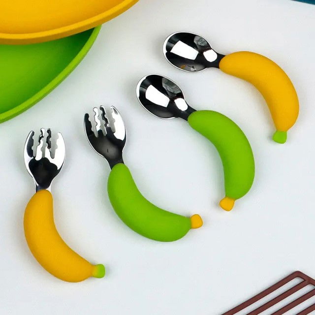 Tacamurile incluse in set sunt fabricate din otel inoxidabil de inalta calitate, ceea ce le face rezistente, durabile si sigure pentru contactul cu alimentele. Manerele sunt din silicon moale, au forma draguta de banane si pot fi prinse cu usurinta de cei mici.