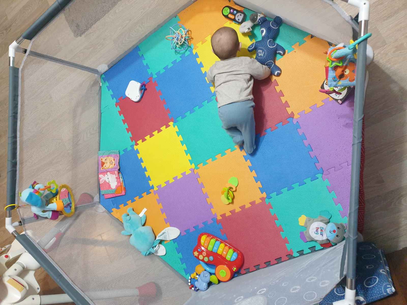 Tarcul are 6 laterale cu inaltime de 64.5 cm. Husa este din plasa prin care se poate vedea, atat din exterior, cat si interior. Una din laterale este prevazuta cu o usa cu fermoar pe unde cel mic poate iesi sau intra in tarc - vezi detalii produs aici.