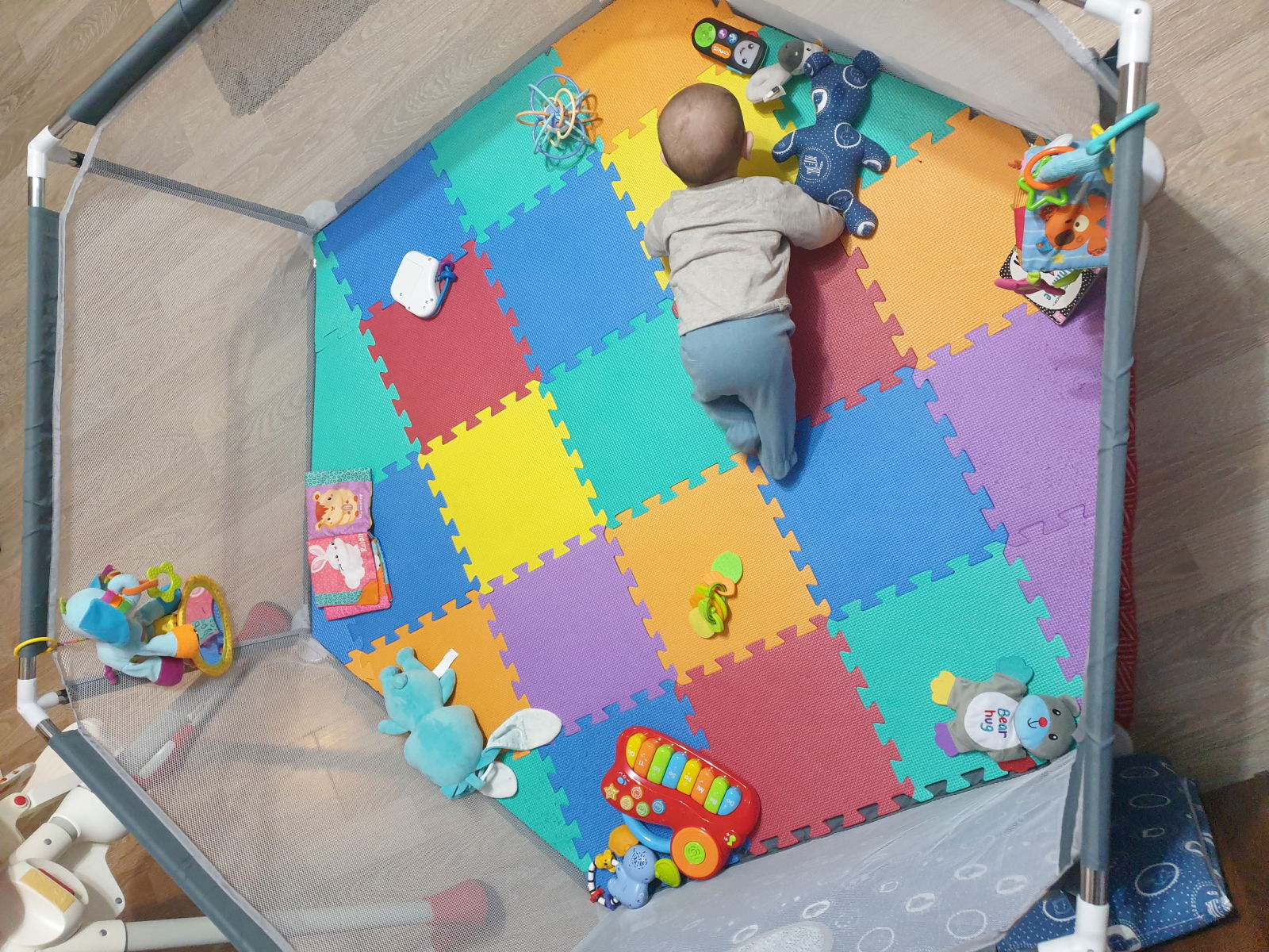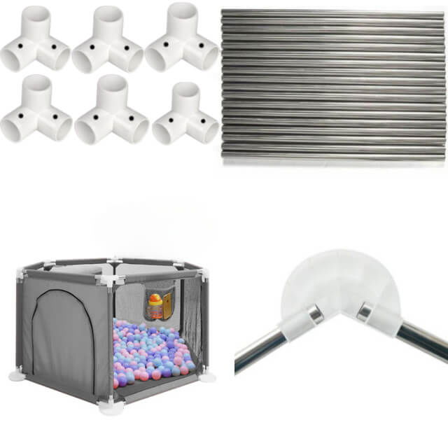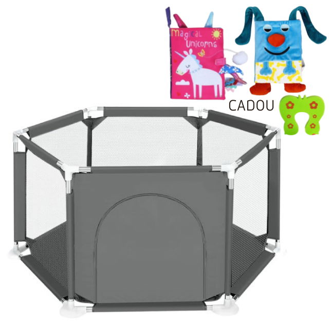 Tarcul are 6 laterale cu inaltime de 64.5 cm. Husa este din plasa prin care se poate vedea, atat din exterior, cat si interior. Una din laterale este prevazuta cu o usa cu fermoar pe unde cel mic poate iesi sau intra in tarc.