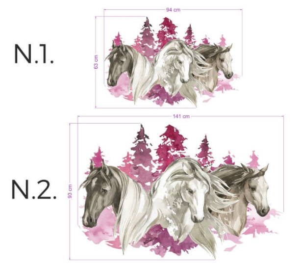 Adauga o nota de eleganta si mister in camera fetitei tale! Acest autocolant de perete de la INSPIO prezinta trei cai frumosi pe un fundal vibrant de padure, perfect pentru a inspira visare si iubire pentru natura. Culorile suave si designul artistic transforma orice camera intr-un colt de basm.