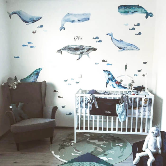 Design: Balene albastre si pesti mici, perfecti pentru a aduce un strop de veselie si aventura marina in orice incapere.